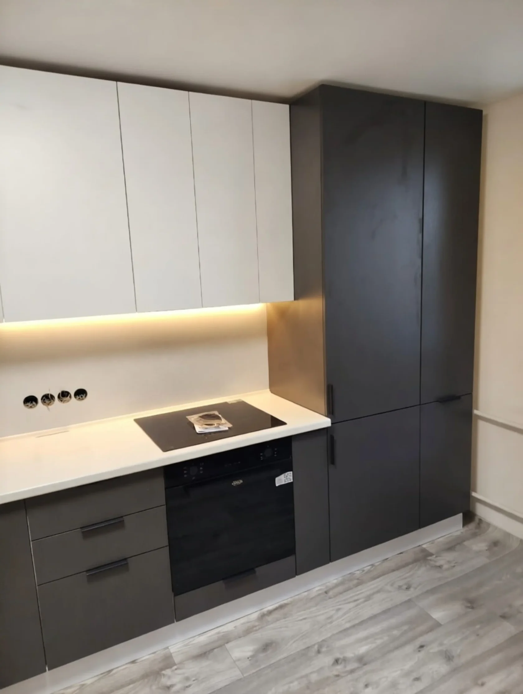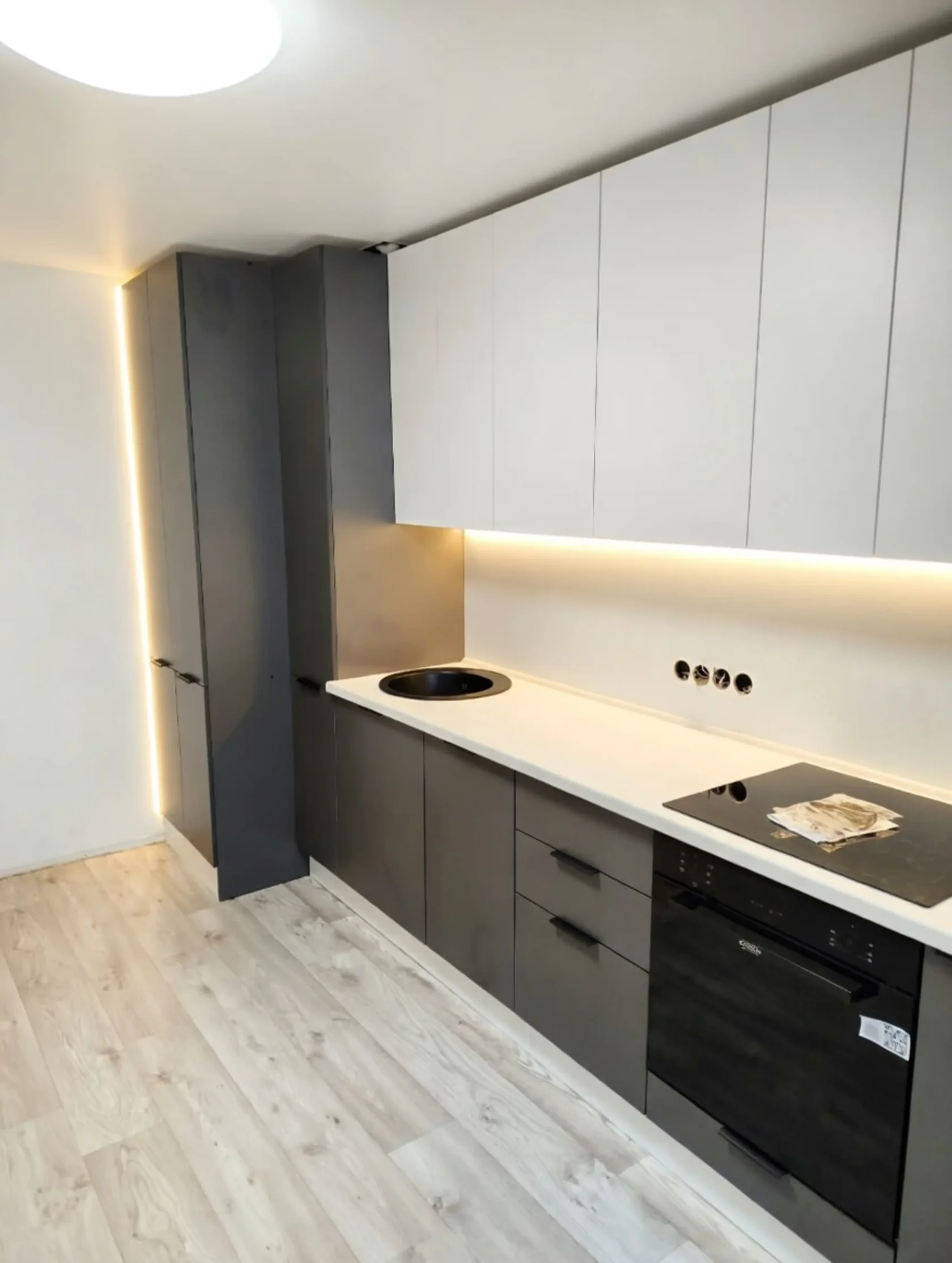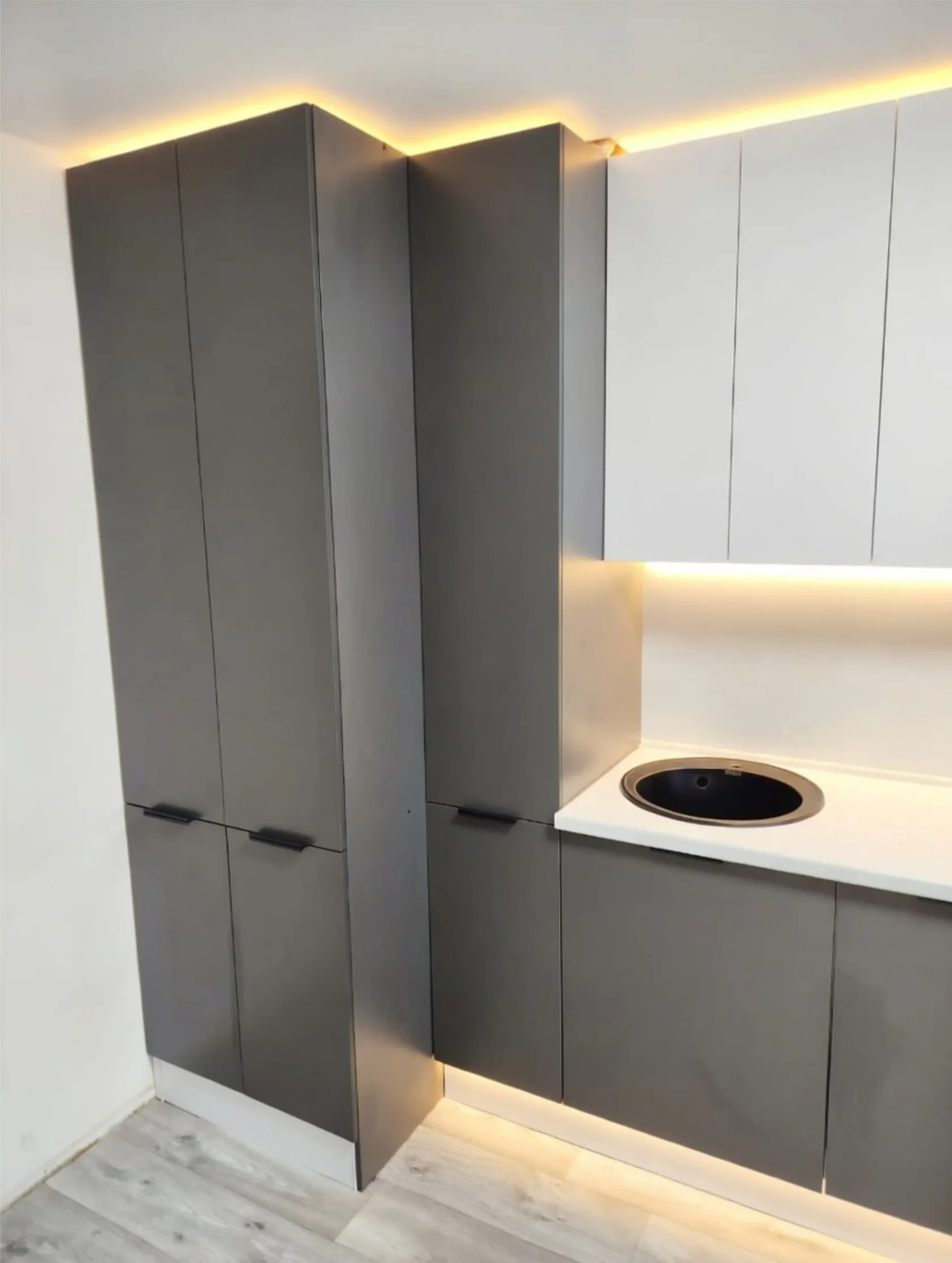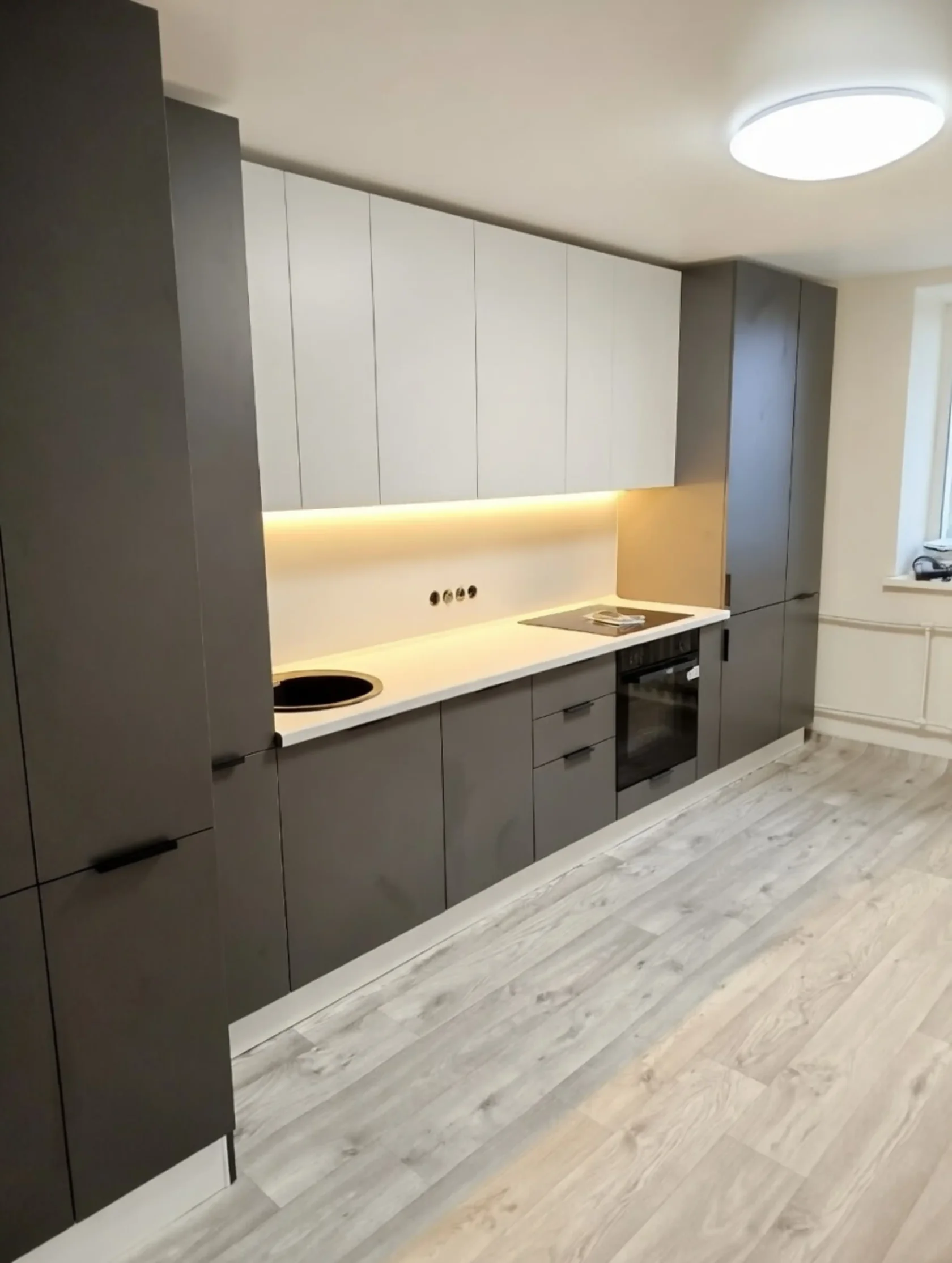 Большая, качественная и нестандартная кухня в цвете «Графит софт» Почему именно этот цвет? Все просто! Именно он подходит для классических интерьеров и для холодных в стиле лофт. ⠀ Эта кухня установлена на Красной Речке, где основной проблемой является колонна и трубы водоснабжения. Наши дизайнеры нашли решение, как не потерять полезную площадь и сделать кухню красивой.
