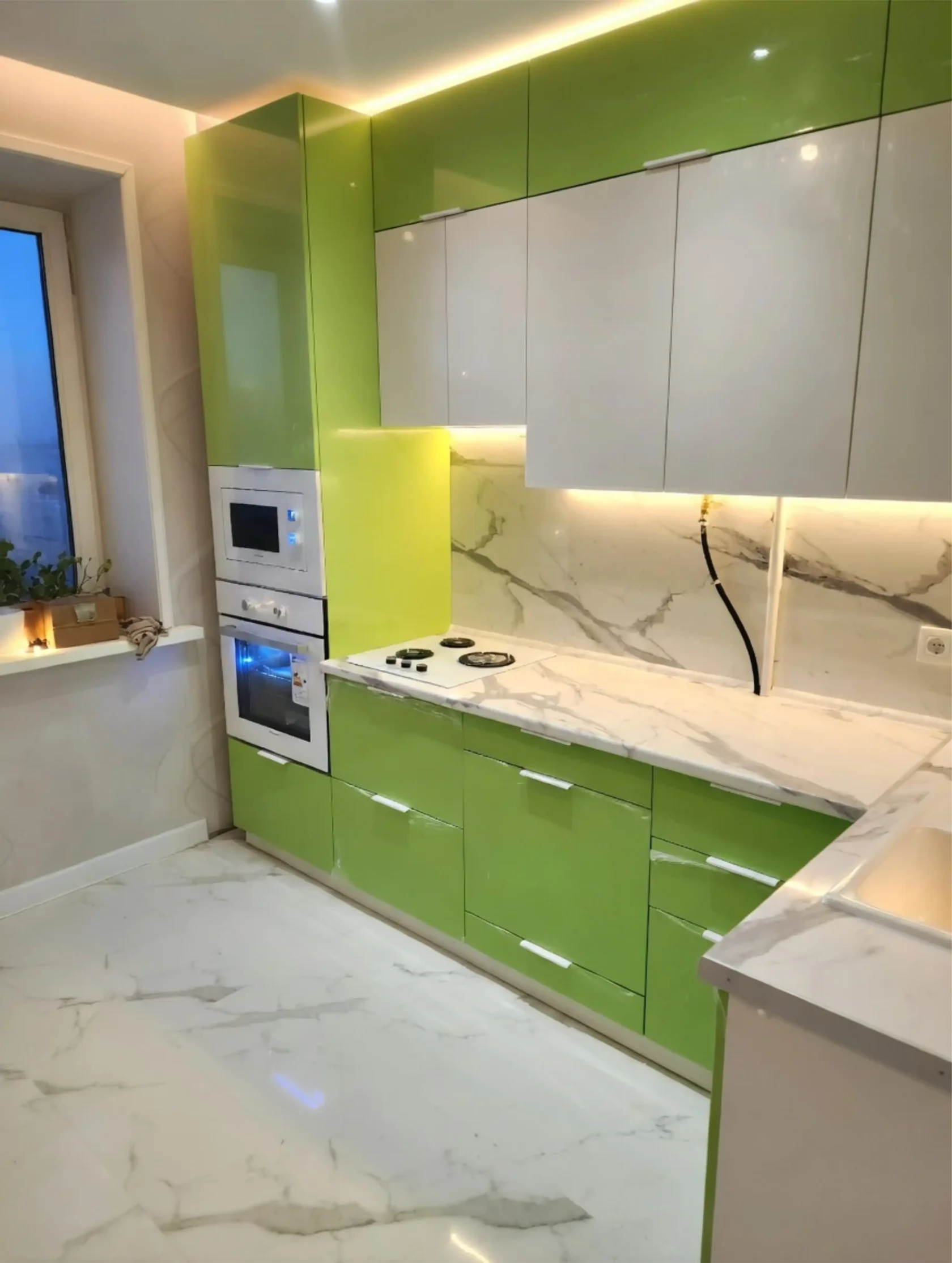 Наши кухни могут иметь сотни оттенков, которые идеально впишутся в современный интерьер. Верхние модули высокие и стандартные, спец.модули для микроволновки. Встроенная посудомойка - не проблема!
